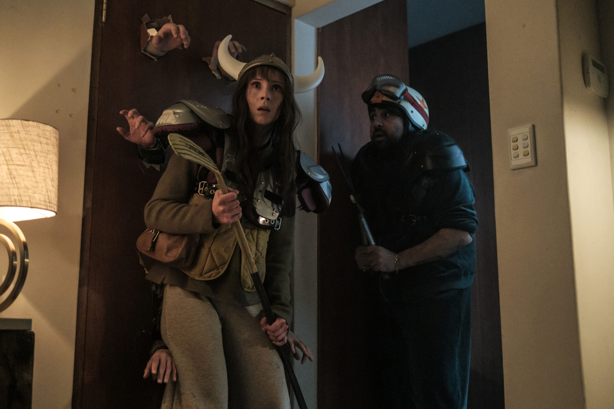 Empecemos por Sam Rockwell, que vuelve a demostrar que no hay nadie mejor para interpretar el caos carismático. Su personaje, el viajero del futuro, podría haber caído en el cliché del guerrero atormentado, pero Rockwell le otorga una vulnerabilidad nerviosa y un humor ácido que lo hace único. Es el motor de la película, saltando entre la desesperación absoluta y una confianza ciega que arrastra al resto del reparto. En cambio, Haley Lu Richardson es el corazón analógico, es decir, si Rockwell es el motor, Richardson es el volante. Su interpretación es fundamental porque representa al espectador: la persona común atrapada en una locura tecnológica. Aporta una naturalidad refrescante y una fuerza silenciosa que equilibra la energía cinética de Rockwell. Su evolución de la incredulidad al liderazgo es el arco emocional más satisfactorio de la cinta.